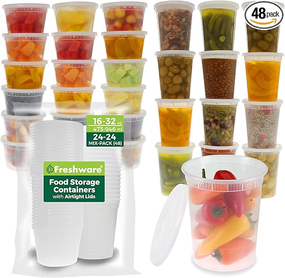 Freshware 48 Pack of 16 and 32 oz, 24 sets each size Food Storage Containers with Lids, Plastic Deli Containers,